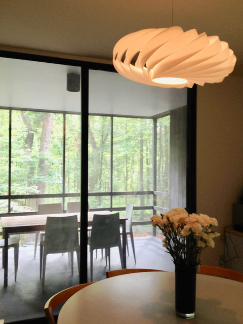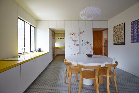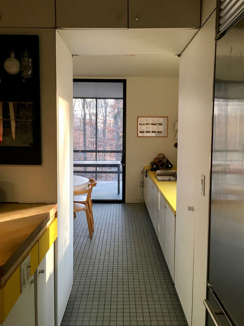 The kitchen has Sub-Zero, Asko, and Jenn-Air appliances. It also has its original Formica counter tops that were formulated to Piet Mondrian’s exact color requirements. The cabinetry in the kitchen and bathrooms was custom designed. Planned for a Kosher household, the kitchen has an unusually generous amount of storage for dishes (including a distinct area for Passover dishes) There is a separate eating area off the kitchen with additional two burner cook-top to supplement four burners on the kitchen island; one of the porches –which is protected from wind or rain- adjoins the eating space so that it is possible to have dinner outside most nights from April-October. The dining room, on the same level as the kitchen, is adjacent to its own porch and overlooks deep woods. The laundry is on the same level as the kitchen, dining room, study, and tiled full bathroom.